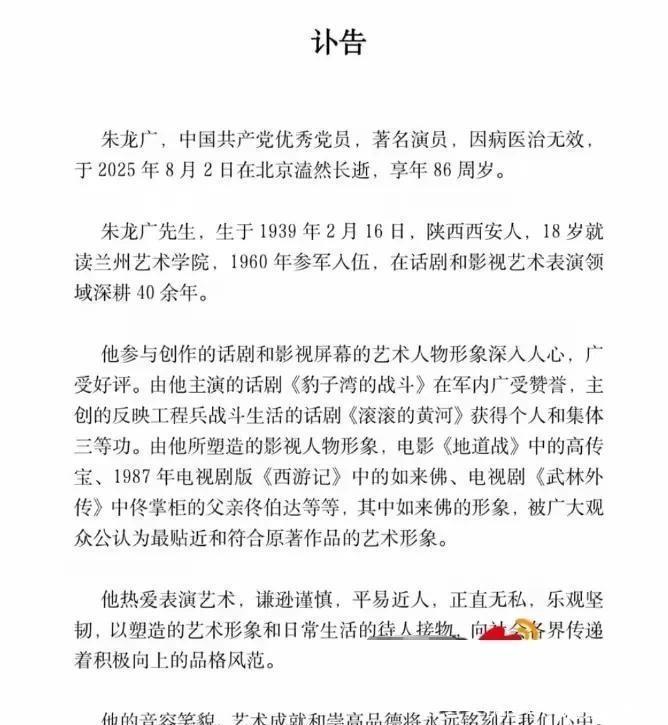 “佛祖”真的走了! 这两天文娱圈传来一个让东说念主唏嘘的音书——86版《西纪行》如来佛祖的饰演者朱龙广耗费了,享年86岁。他夫人吴慧芳发的讣告里说,老爷子走得挺正经,但具体啥病没细说。6月份还有东说念主跟他合影,其时分看着精神头还可以,没思到两个月后东说念主就没了……一代东说念主的童年追念,就这样赶走了。