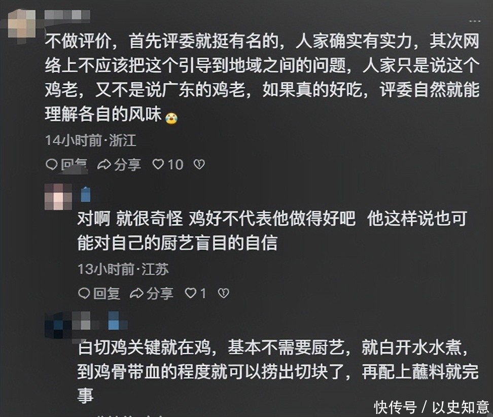 同期辅导网友不应将此事飞腾为地域对立,评委仅仅指出鸡肉偏老,并非狡赖广东举座鸡种,若真好意思味,评委天然会交融。