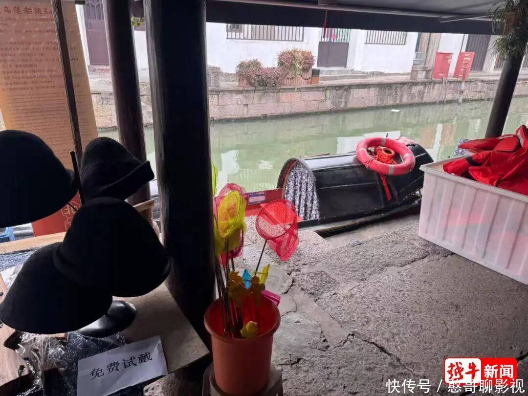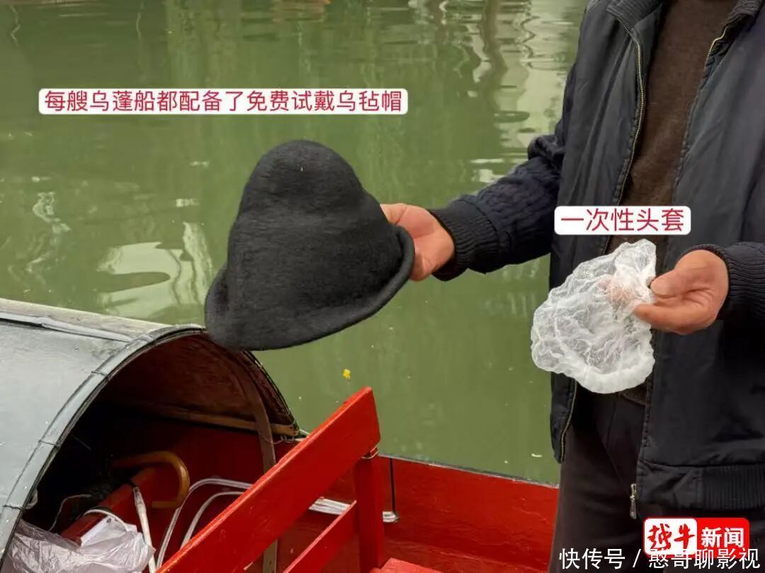 乌篷船职责主说念主员向记者展示乌毡帽免费试戴历程